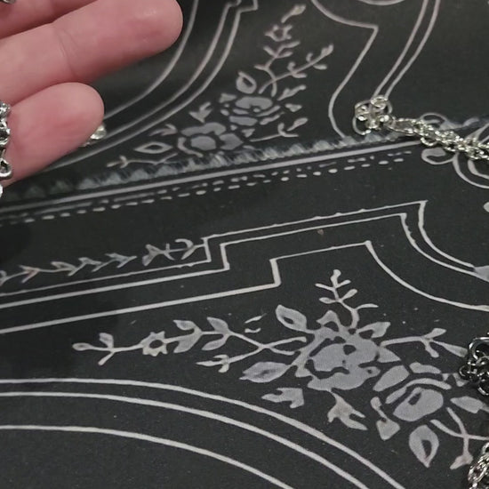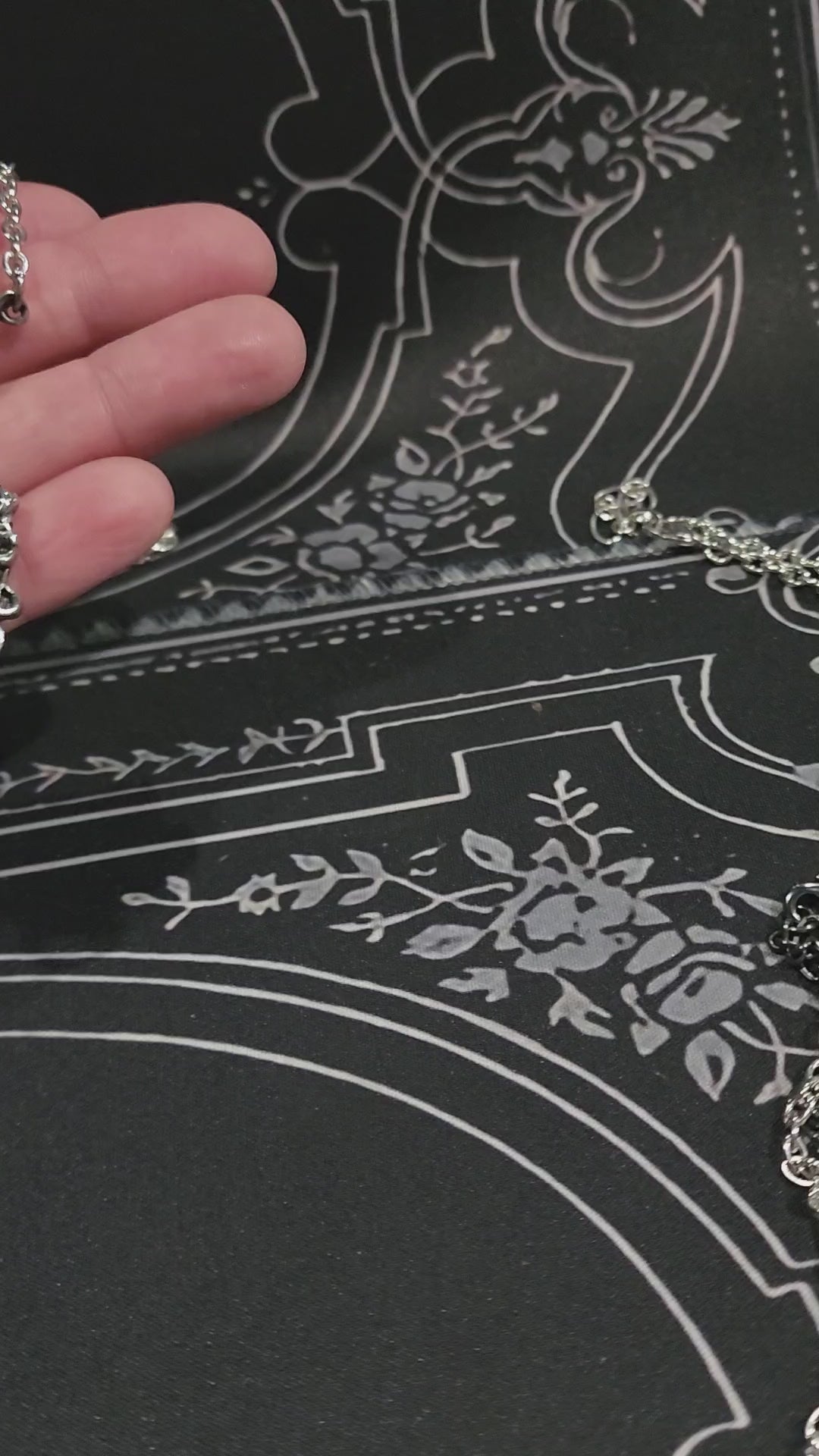 Approximate Dimensions: H: 58mm (2.28") W: 36mm (1.42") D: 8mm (0.31") Weight: 24g (0.85oz) Chain: On a 19" (53cm) curb chain plus a 1 ½" extender chain. Materials:Pewter, Resin, Mirror