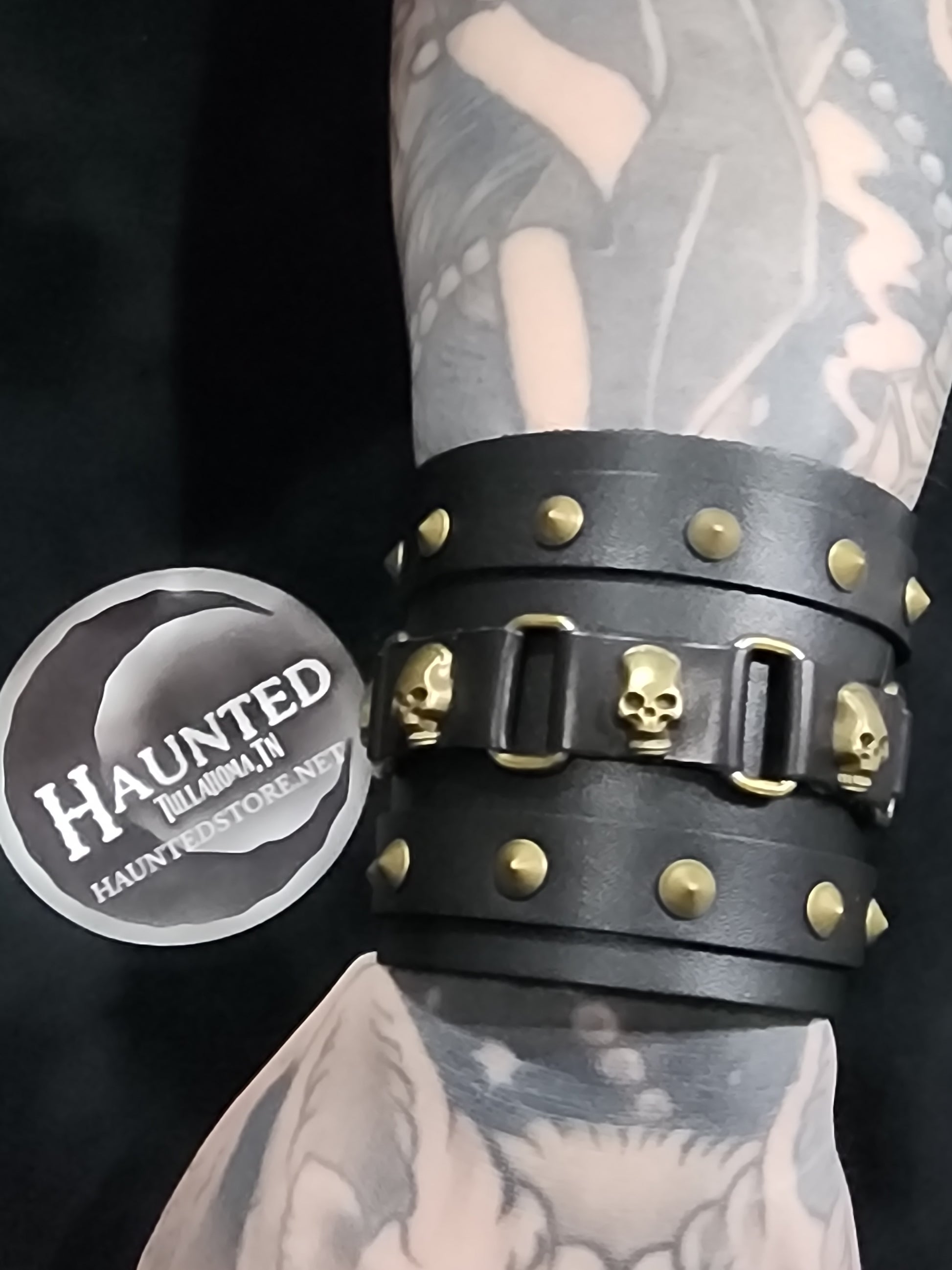 Unleash your inner gothic style with our Black Leather Gothic Skull Heavy Bracelet. Made with high-quality leather and adorned with vintage rivets and a bucket design, this bracelet is perfect for those who want to make a bold statement. Embrace your unique style and add an edgy touch to any outfit.