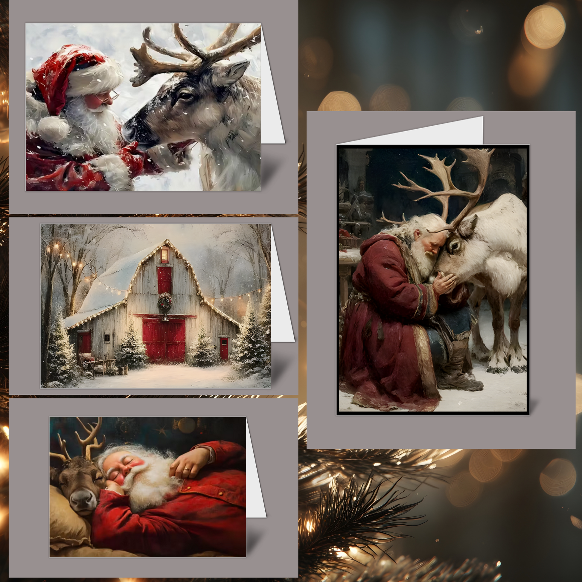 Santa, Reindeer Barn Christmas Holiday Greeting Card