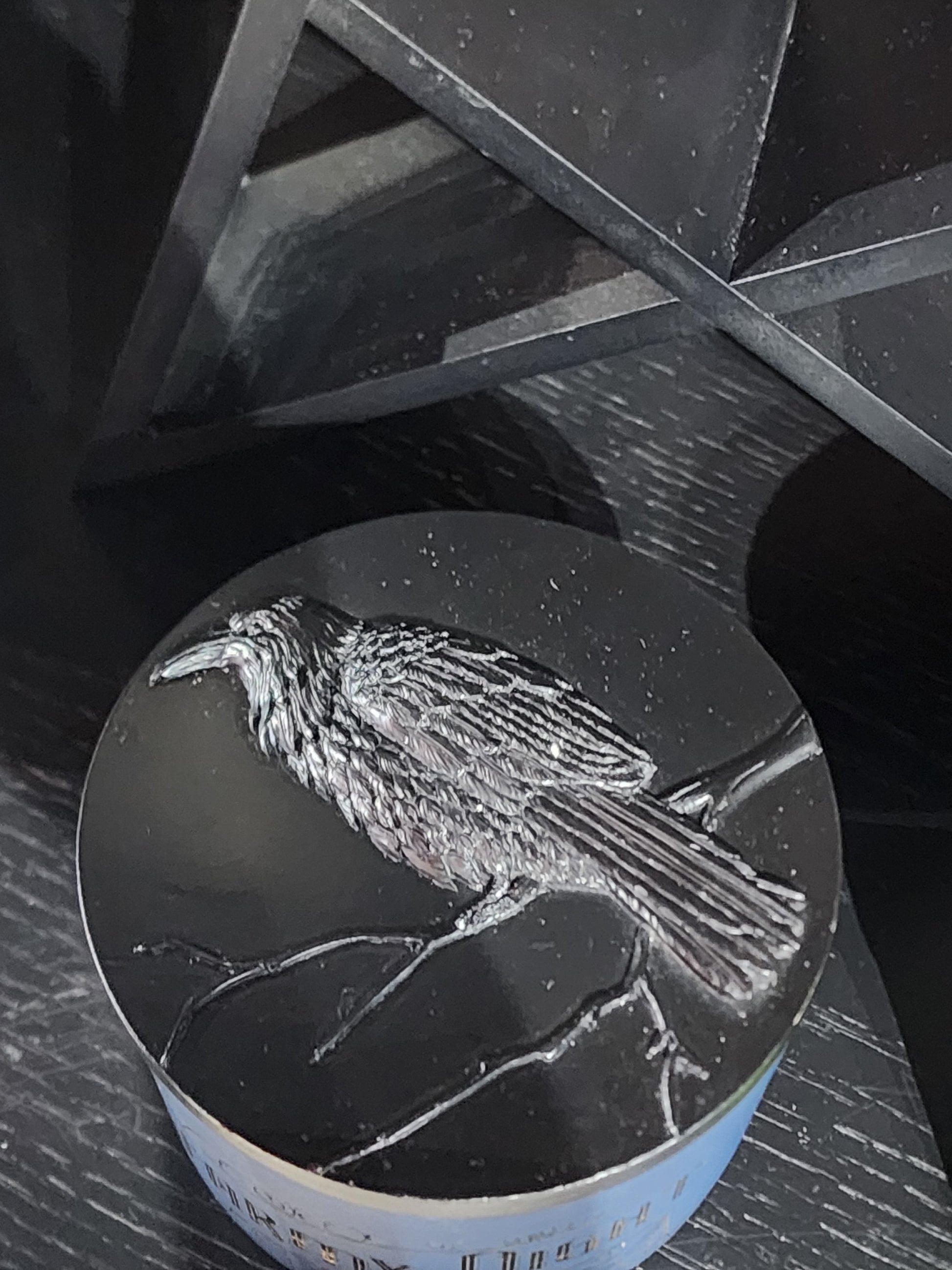 10.3 oz Decorative Crow Lid Black Woodland moss wrapped in aromatic herbs and balsamic amber infused with incense and elements of dark, opulent woods.