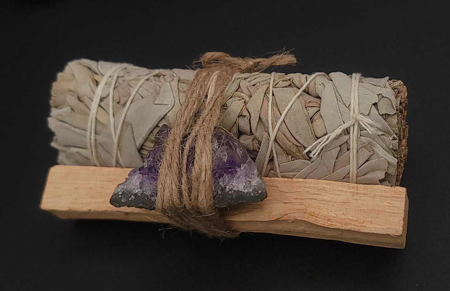 Introducing Energy Cleansing Essentials! Cleanse your space and uplift your energy with this white sage bundle, palo santo stick, and Amethyst crystal with a smudge dish. Follow the included instructions to bring in positive vibes and get rid of negative energy. Elevate your spiritual practice today!