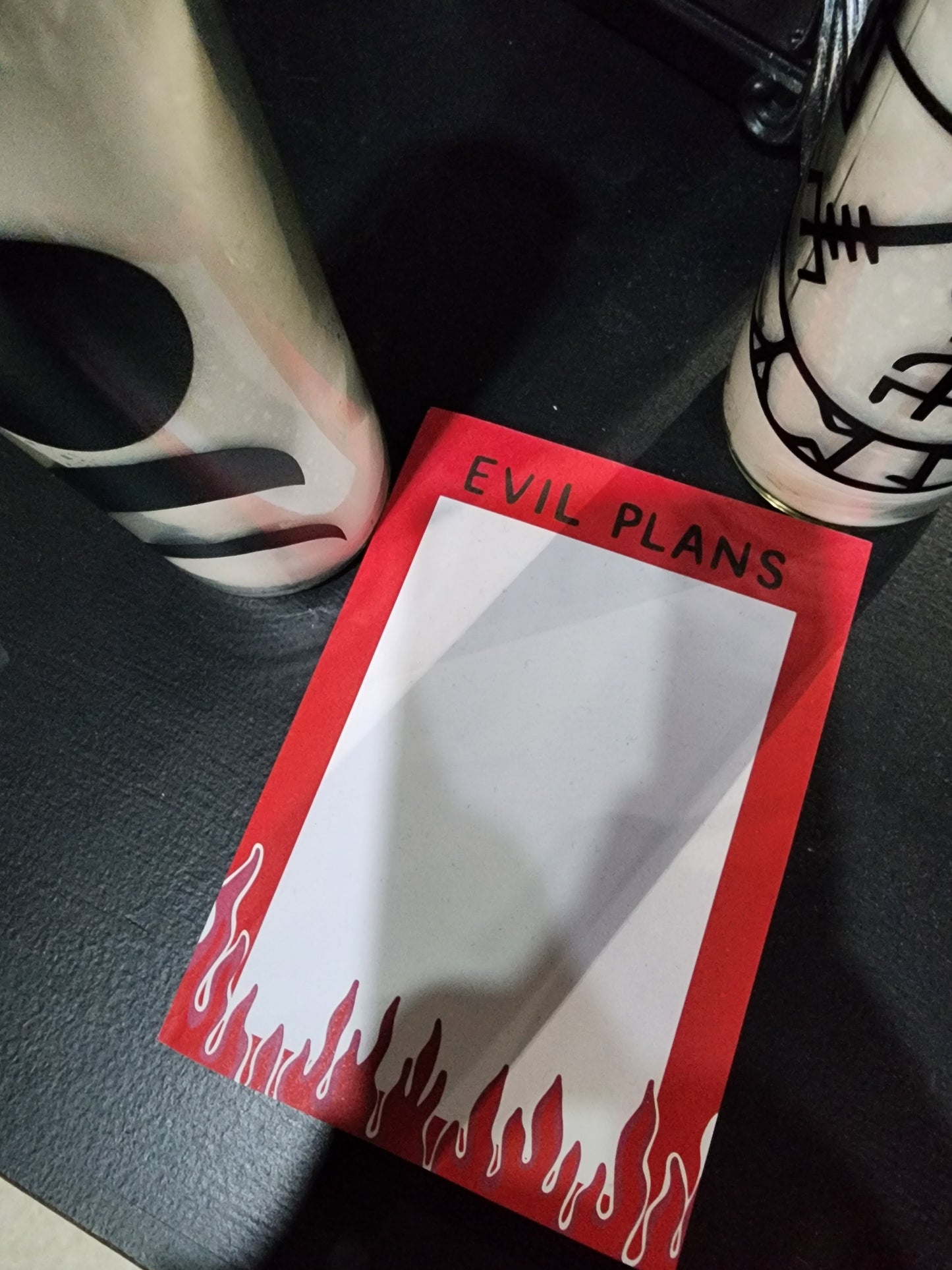 Unleash your inner mastermind with the Evil Plans Note Pad! Stay organized and plan your next villainous scheme with style. Never forget a detail as you jot down your ideas on this sleek, intimidating note pad. Perfect for any aspiring supervillain or mischief-maker.