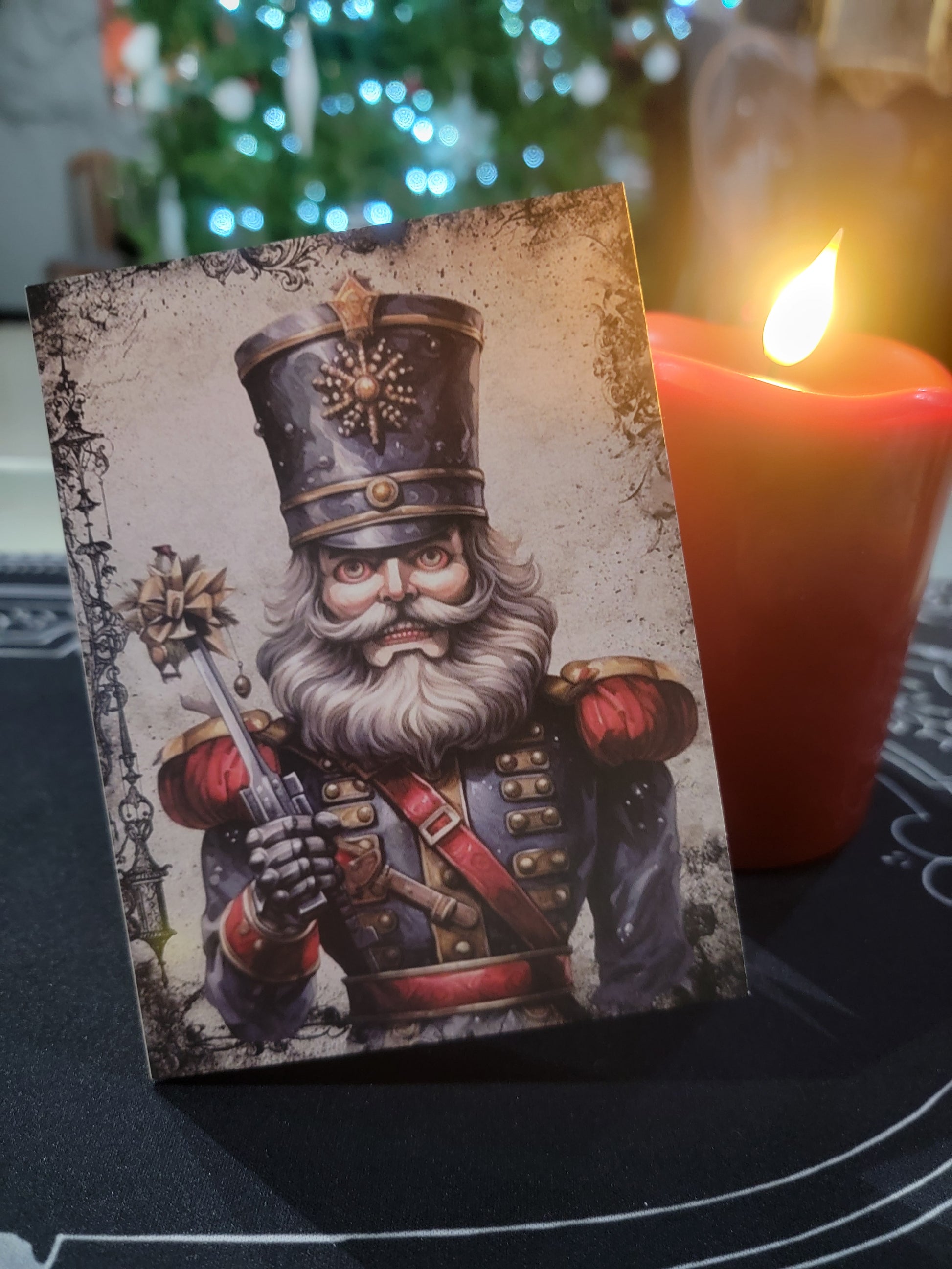 Celebrate a dark and mysterious Christmas with our Gothic Christmas Card! Featuring a gothic tree, spooky nutcracker, haunted snowman, creepy Santa, and gothic girl, this card is perfect for those who want to add a touch of the macabre to their holiday season. Send it to your fellow lovers of all things eerie and unique!