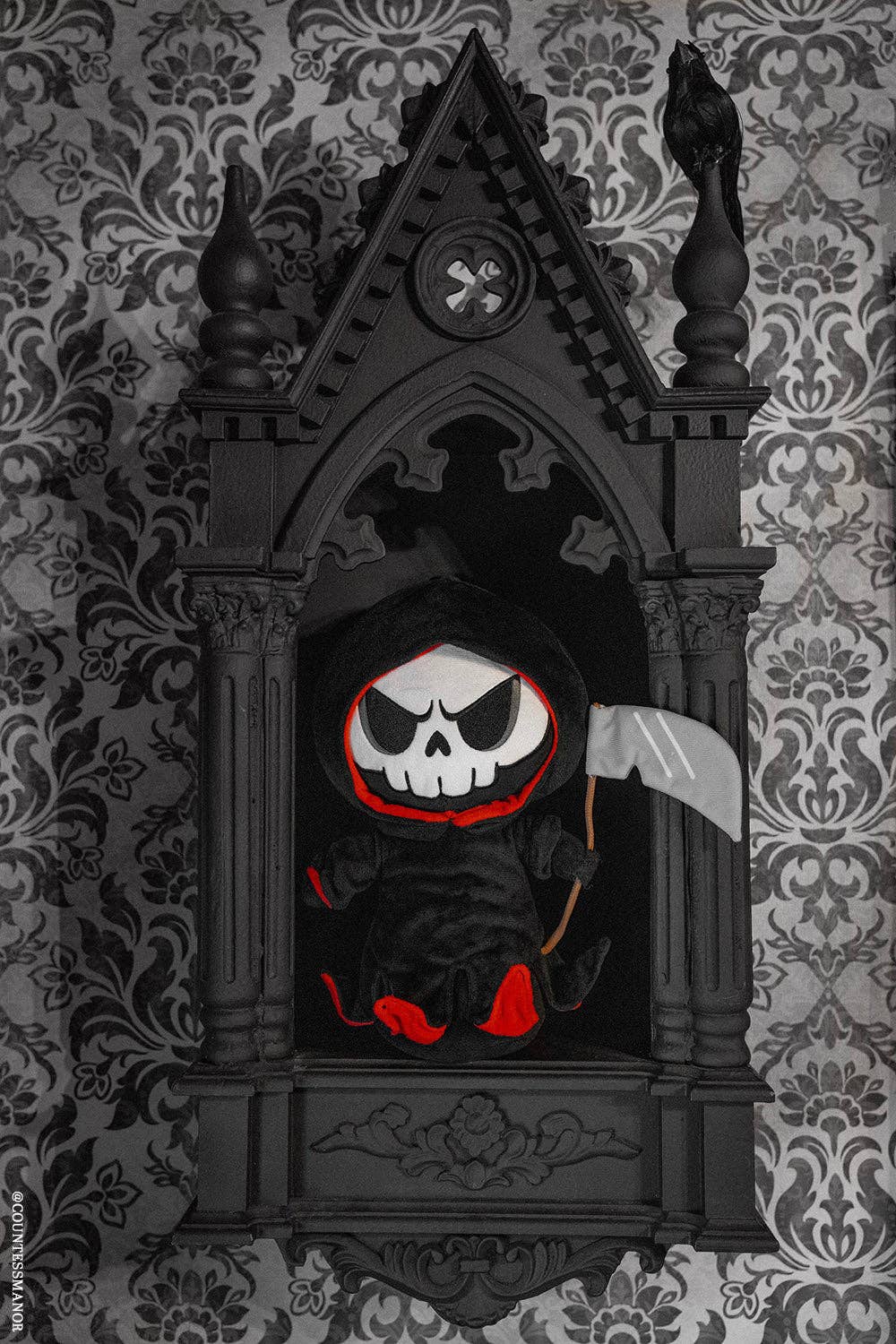 Note: This is our second interactive plush toy ever! The hood of the reaper's cape is detachable, and his scythe can be posed however pleases your dark heart. Featuring @countessmanor and @kenziecakes!