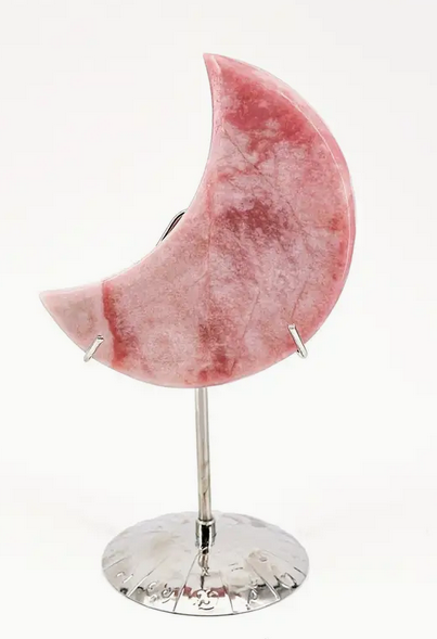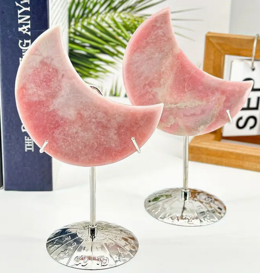 Unleash the magic of the stars with our Pink Opal crystal moon, elegantly displayed on a metal stand. Perfect for celestial lovers and zodiac enthusiasts, this stunning piece brings positive energy and peace into any space. Elevate your decor and spirit with this beautiful Pink Opal crystal moon!