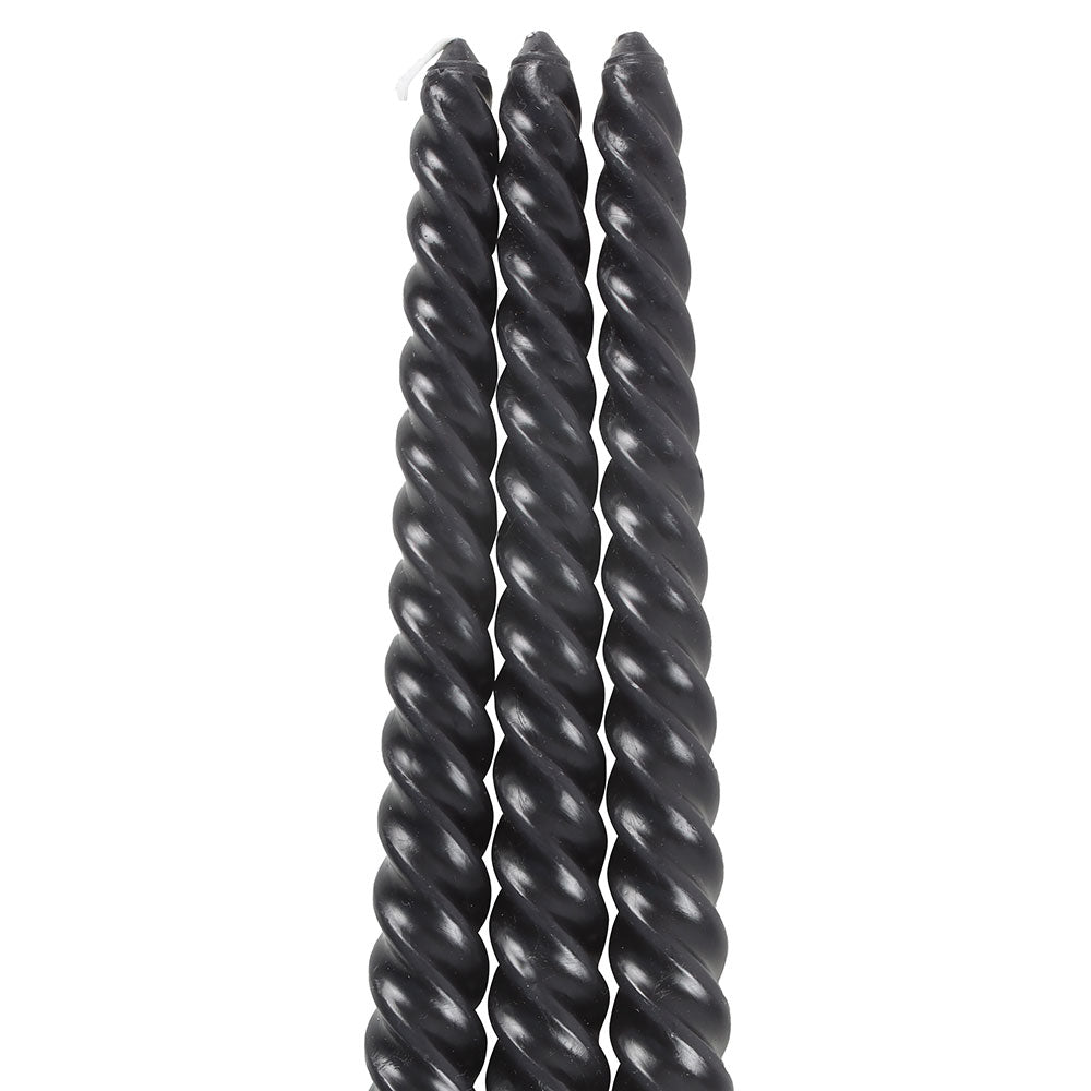 With a twisted silhouette and rich black hue, this set of three taper candles adds a dramatic flourish to candlelit tables and gothic interiors. Unscented and effortlessly striking, they’re made for decadent dinners and shadowy soirées. Made from paraffin wax.