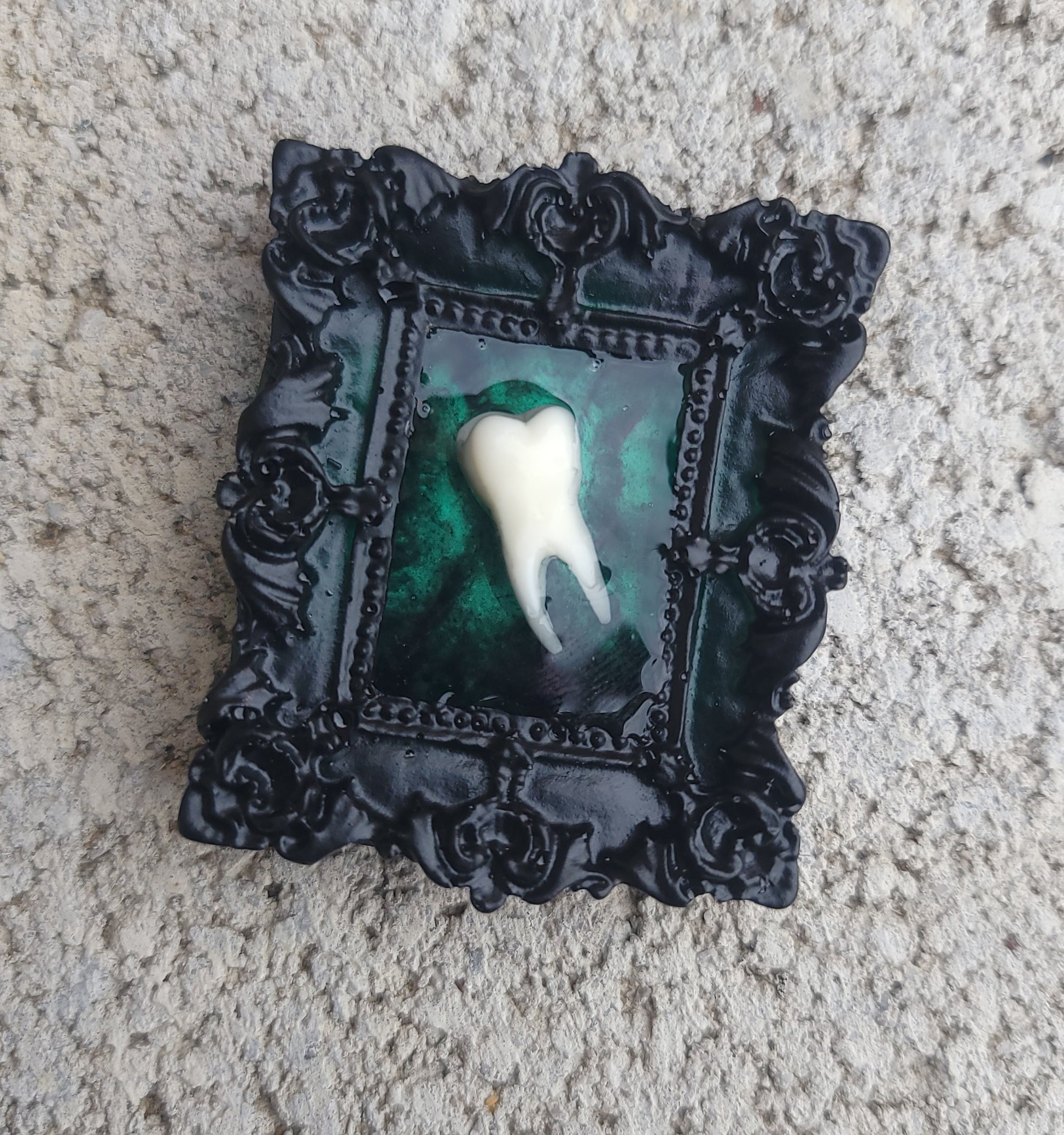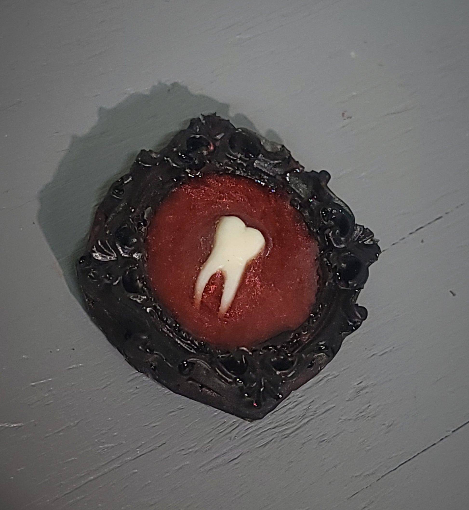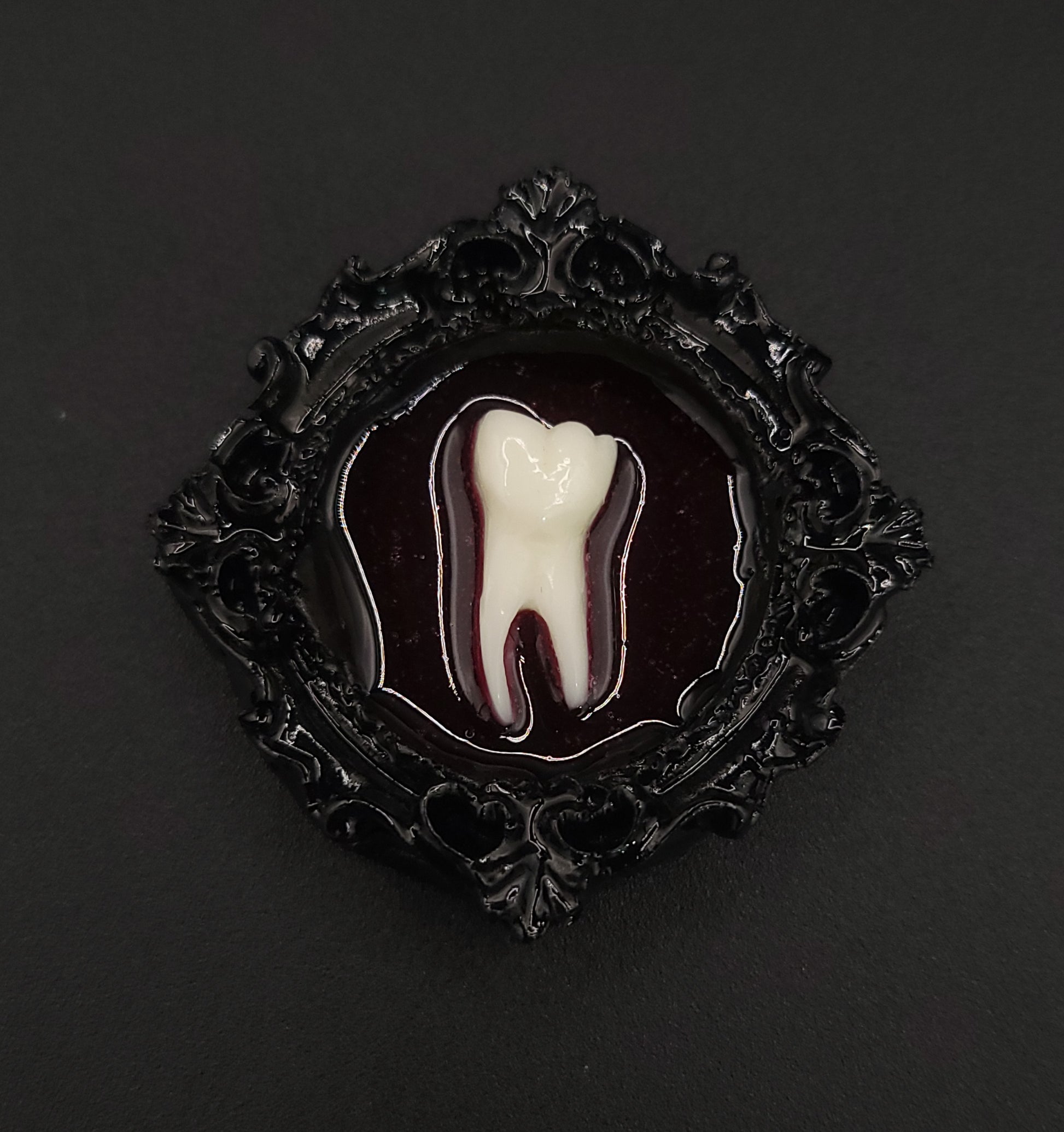 Indulge in the dark and mysterious with The Forsaken Tooth Magnet. Featuring a framed tooth in a pool of blood, this gothic-themed magnet is a unique addition to any collection. Let it inspire a sense of intrigue and captivate your imagination.